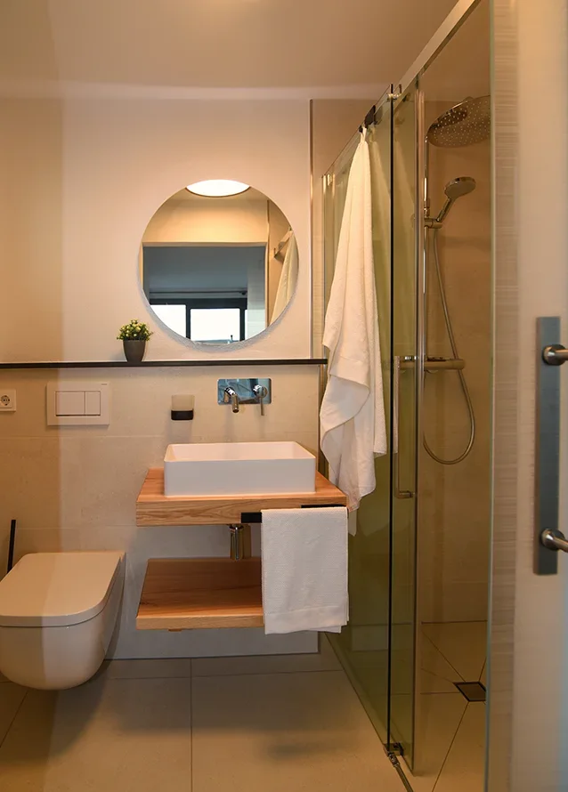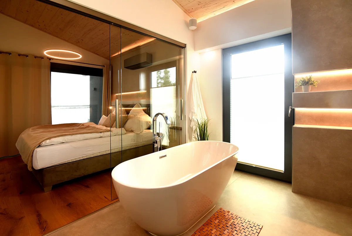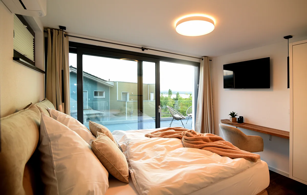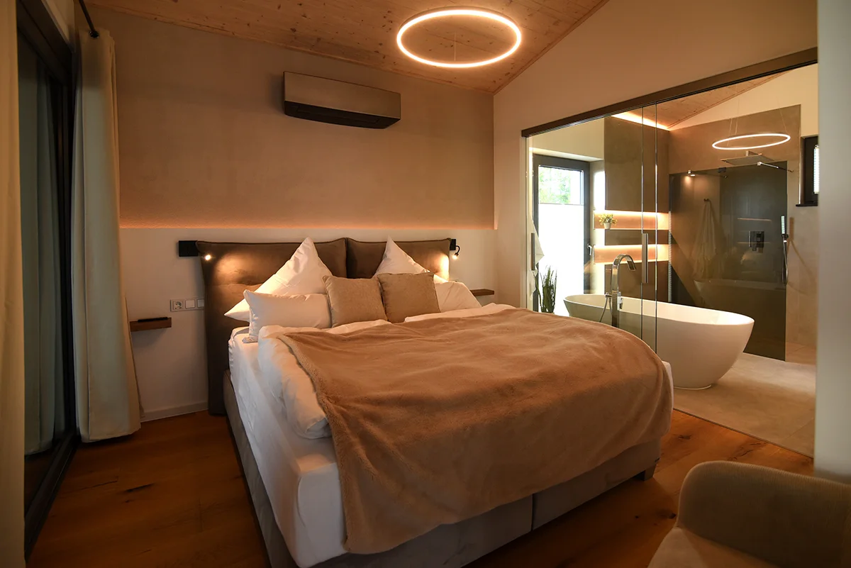 Das Petit Chalet 69 - Am Hainer See in Neukieritzsch verfügt mit seinen über 180m³ Wohnfläche über 3 separate Schlafzimmer für je 2 Personen. 2 Schlafzimmer mit je einem Bad/Dusche/WC befinden sich im Erdgeschoß, 1 Schlafzimmer befindet sich im Obergeschoss mit offenen Bad – freistehender Badewanne/Dusche/WC. Alle Schlafzimmer verfügen über eine Klimaanlage und Flach-TV.