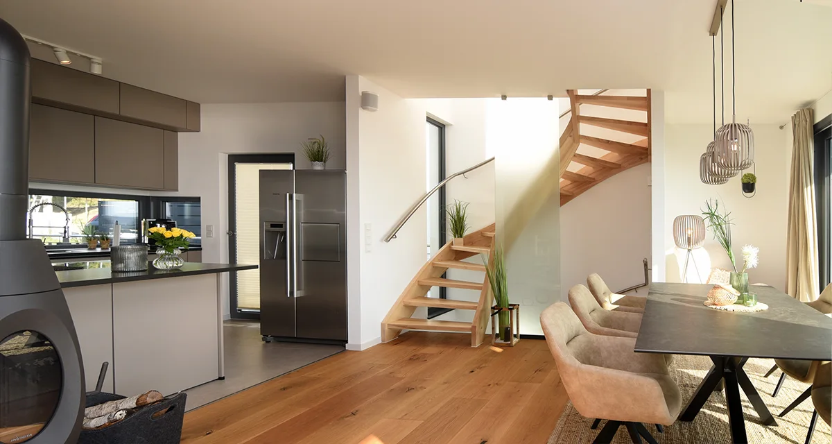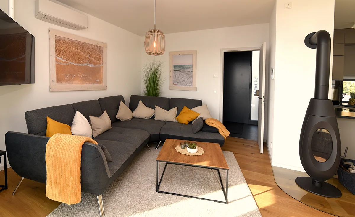 Aber auch innen ist's gemütlich - mit Kaminofen, großen Esstisch für 6 Personen und Relax-Sitzecke. Wer gerne kocht, wird die vollausgestattete Küche mit Kochinsel lieben.