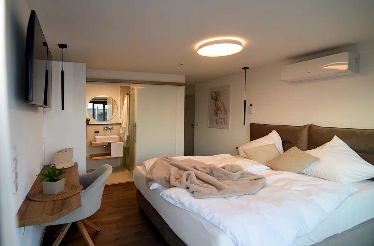 Drei Parkplätze stehen Ihnen kostenfrei vor dem Haus zur Verfügung. Gäste, die mit einem E-Auto anreisen, haben die Möglichkeit, ihr Auto an unserer Wallbox kostenpflichtig aufzuladen. Das Haus kann im Sommer mit den Klimaanlagen über die Fotovoltaik Anlage klimatisiert und an kühleren Tagen über die Fußbodenheizung beheizt werden. Eine Beschattung erfolgt über moderne Textilrollos außen.