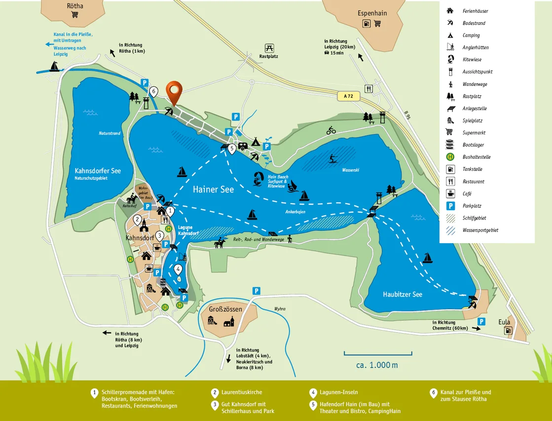 Diese einzigartige Seenlandschaft bietet mit Ihren bereits 23 entstandenen Seen (um nur einige zu nennnen: Cospudener See, der große Goitzschesee, Markkleeberger See, Hainer See, Geiseltalsee, Störmthaler See und Zwenkauer See) für Wassersportler, Familien und Touristen zahlreiche Betätigungs- und Entspannungsmöglichkeiten. Feinsandige Strände, kleine Häfen und neue Wassersportanlagen sorgen für eine außerordentliche Vielfalt - so entsteht nach und nach ein wunderbares, riesiges Naturerholungsgebiet im Umkreis von Leipzig.